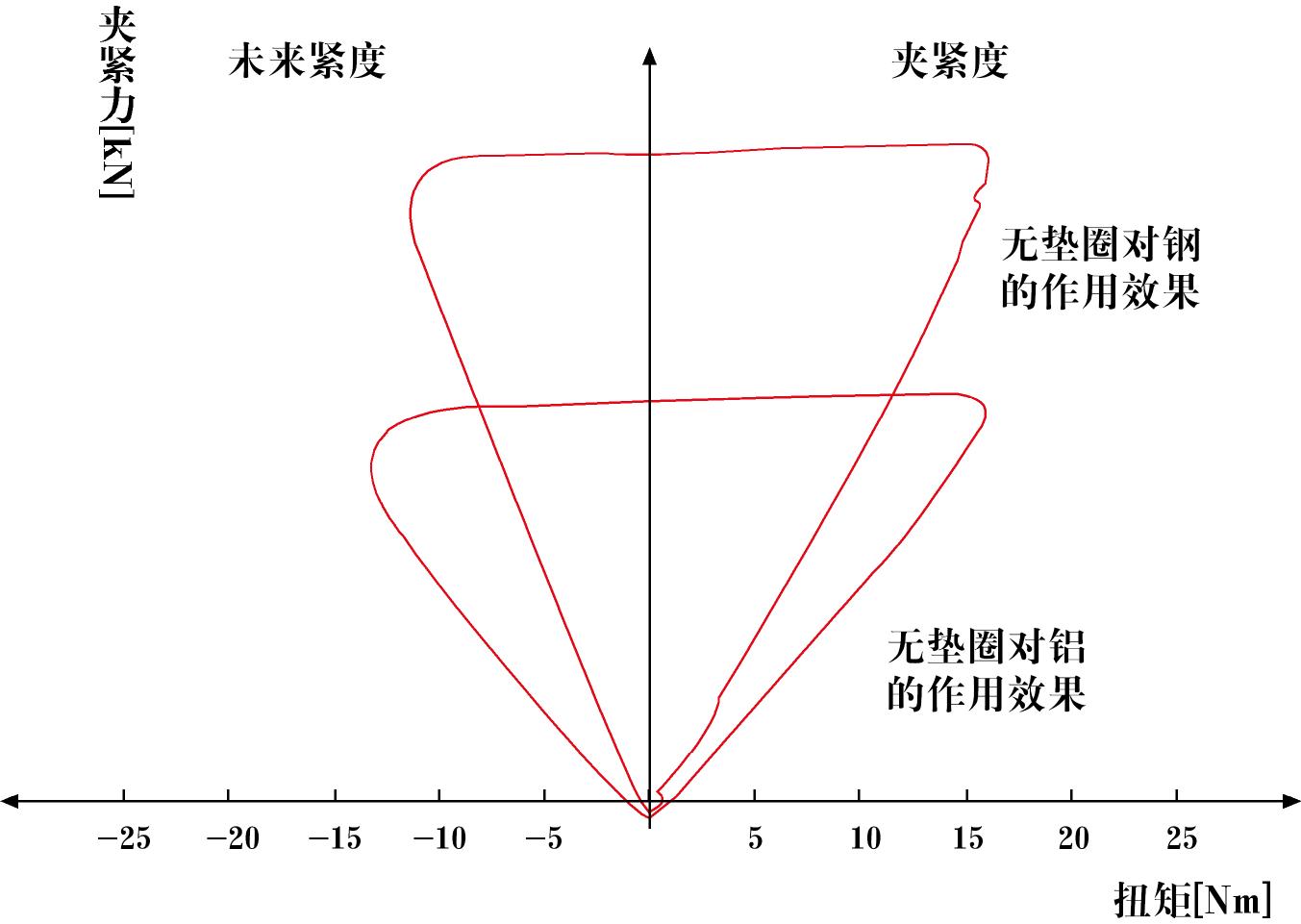 ◆这个图表显示了没有使用任何垫圈时,夹紧力的偏差。当使用相同的拧紧扭矩时,由于拧紧在不同的材料上(铝或钢),您将得到不同的夹紧力。因为在铝材料上拧紧时摩擦力更高,所以夹紧力将会低很多。