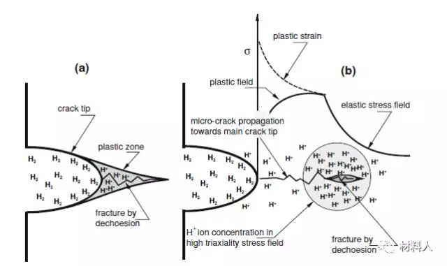 图 1 a)H在裂尖前富集,产生裂纹并扩展;
