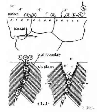 Latanision 等认为由于硫、磷、砷、锑、锡、铋等杂质元素会阻碍氢原子重新组合形成氢气,如图 3所示。从而,氢原子能沿着锑、锡沉积路径自由进入金属基体,使得晶界变脆。